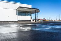 This stock photo features a parking lot located in Toronto, Ontario, Canada. The parking lot is completely coated with concrete and black asphalt, creating a smooth surface. The image showcases a clear sky overhead, indicating that it is a sunny day. The parking lot is surrounded by various shopping establishments, including storefronts and shops. This photo is perfect for illustrating urban environments, transportation, and commercial areas in Toronto, Ontario, Canada.