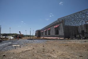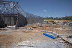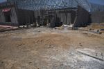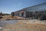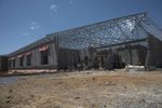 the image shows an empty building in the sand and ground with construction in progress in the background