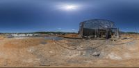 An abandoned building stands alone in a sandy landscape, surrounded by a construction site. Clear skies and contrails overhead add a touch of urban charm to this rural setting.