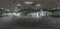 a 360 - view camera fish - eye image shows an abandoned warehouse with no doors