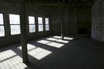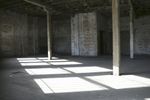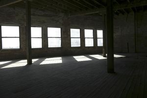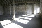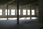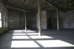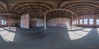 A panoramic view of an abandoned warehouse with exposed woodwork and arches. The large empty building offers a glimpse into its industrial past. Sunlight streams through the windows, casting long shadows on the concrete floor.