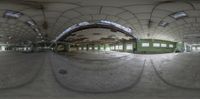 an empty warehouse, full of concrete and with circular mirrors, at the end of it