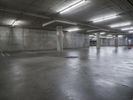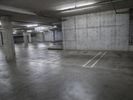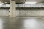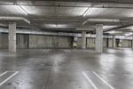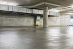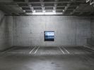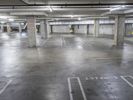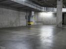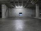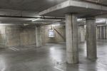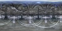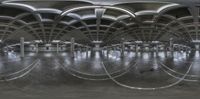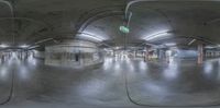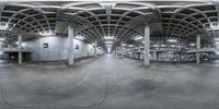 A 360-view photo from above captures the symmetrical architecture of a city. The straight road leads to a city center with high-rise buildings and parking lots. The tunnel, lined with concrete walls and columns, creates an industrial atmosphere with artificial lighting.