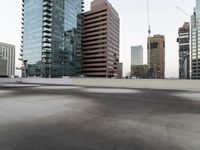 This stock photo features an abstract cityscape with skyscrapers and a skyline. The photo has a clear sky and showcases the urban metropolitan area with its high-rise buildings. The architecture and concrete structures create a modern city atmosphere. The image also captures a residential area and a parking garage, reflecting the infrastructure of a bustling city. The daytime lighting casts hard shadows on the buildings, adding depth to the composition. This photo can be used to represent a vibrant downtown district or as a packshot for real estate or urban development projects.