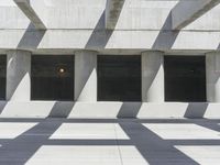 This stock photo features an abstract monochrome urban architecture in Los Angeles, California, USA. The image showcases a city road with a concrete bridge and underpass. The building's facade is in a brutalist architecture style, characterized by its profile and symmetry. The concrete street adds an interesting design element with its hard shadow. Perfect for any project that requires a unique and modern urban aesthetic.