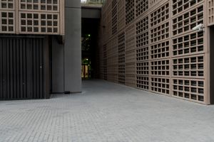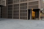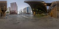 Architectural structures in downtown Abu Dhabi, United Arab Emirates. The buildings feature unique facades with circular mirrors made of stone blocks. Open spaces and urban infrastructure create a vibrant city atmosphere.