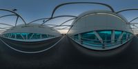 A stunning architecture design building in Abu Dhabi, United Arab Emirates. The clear sky reflects in the circular mirrors, adding a touch of modernity. Yas Marina and palm trees provide a scenic backdrop.