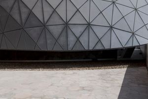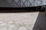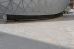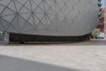 A fisheye lens photo of a building in Abu Dhabi, United Arab Emirates. The city's modern architecture is showcased with concrete and steel structures. Symmetrical lines, open spaces, and a dome add to the urban charm.