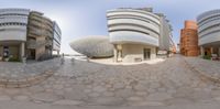 this is a fisheye lens photo of a building and some buildings on it's side