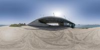 Ground-level view under a concrete bridge in Abu Dhabi, United Arab Emirates. Coastal landscape with sandy beach and clear sky. The bridge serves as an infrastructure connecting the road to the beach.