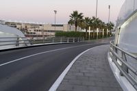 A clear dawn sky over the cityscape of Abu Dhabi, United Arab Emirates. The urban infrastructure includes a winding road with asphalt surface, guarded by railings. Yas Marina and the iconic fixed link are visible in the background.