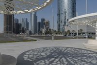 A clear sky over downtown Abu Dhabi, the urban metropolis of the United Arab Emirates. High-rise buildings and skyscrapers dominate the cityscape, with modern architecture and open spaces. Walkways and roads surface connect the bustling metropolis.