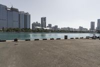 This is an image of the downtown area of Abu Dhabi, United Arab Emirates. The skyline is dominated by high-rise buildings and skyscrapers, reflecting the urban and metropolitan nature of the city. The clear sky above contrasts with the open spaces and surface of the water, which is visible in the foreground. The architectural style of the buildings showcases a modern and contemporary design, including condominiums and residential structures. Overall, this photo represents the vibrant and dynamic atmosphere of Abu Dhabi's cityscape.