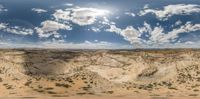 a panoramic view of a landscape and sky showing the terrain of the desert