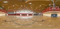 a sports court has two rows of wooden floors and light fixtures on the ceiling above