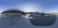 Aerial view of Berlin cityscape at dawn, featuring modern architecture and a prominent bridge over the river. Straight roads and underpasses create an urban design. Clear skies and hard shadows add to the city's charm.