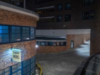Aerial view of Berlin at night showcasing classic European architecture. Cobblestone streets and brick walls give a historic feel. The city's urban design blends with open spaces and courtyards, illuminated by artificial light.