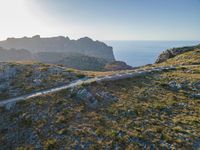 This aerial photo captures the scenic landscape of Mallorca, Spain. The image shows an elevated asphalt road running along a rocky ridge, alongside the sea and cliffs, with a mountain in the distance. The clear sky and clear waters of the Mediterranean add beauty to the coastal view. The Armco barrier provides safety along the high road. This image showcases the stunning nature and coastal beauty of Mallorca, one of the Balearic Islands in Europe.