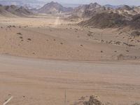 Aerial view of a vast, elevated desert landscape in South Africa. Endless road extends through the brown, barren terrain. Sand street meets the horizon, surrounded by majestic mountains. Nature's masterpiece of untouched beauty.