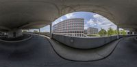 view through circular perspective into concrete buildings and sky line with building in background, from the outside