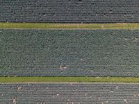 This stunning aerial view captures a vast open space in the rural landscape of Holland. The field, covered in lush green grass, features a beautiful pattern of rectangles created by the asphalt roads and concrete paths. Two horses can be seen, one standing in the middle of the field and another on the far side. The composition of the image highlights the symmetry and top-down perspective, giving a unique perspective of the agricultural scenery. The elevated perspective allows for a comprehensive view of the surrounding countryside, with its serene nature and peaceful atmosphere. This captivating photo is a perfect representation of the picturesque beauty that can be found in the Netherlands, a country known for its scenic landscapes and harmonious blend of nature and agriculture.