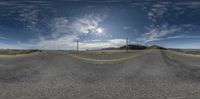 two intersecting roads with a few cars going by on it and a sky background and mountain