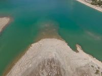 an aerial view of the green water near the land in the distance is a lake that is very calm and clean