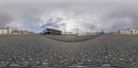 Aerial view of Lisbon, Portugal, with a modern architectural building surrounded by clouds. The black-and-white monochrome image captures the symmetry and open spaces of the city. The spherical perspective adds a unique touch to the urban landscape.