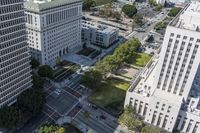 This stunning aerial view showcases the vibrant cityscape of Los Angeles, California, USA. From the top of a high-rise building, you can see the bustling traffic driving down the city streets lined with impressive buildings. The metropolis is surrounded by a network of roads and asphalt, connecting different neighborhoods and residential areas. The classic architecture blends with modern urban design, creating a captivating skyline. This aerial perspective provides an overlook of this thriving metropolitan area, capturing the essence of this dynamic city.