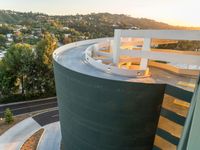 a building with a curved balcony at the top of it near trees and a sunset