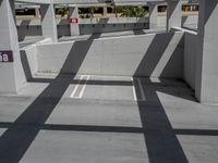 Aerial view of an empty parking garage in Miami Beach, Florida. The top-down perspective showcases the urban design and open space. White pillars and ceiling beams create a high contrast against the concrete surface. A unique perspective of city life in Miami.