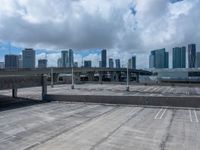 A high position aerial view of a parking deck in Miami Beach, Florida, USA. The deck is located in the urban area of the city, offering convenient parking options on the asphalt surface. The clear blue sky and fluffy clouds provide a picturesque backdrop to the cityscape. This top-down perspective showcases the urban design and layout of the parking garage and the surrounding area.
