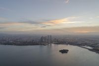 An early morning aerial view of the modern architecture in Zhuzhou, China. The city skyline reflects on the calm lake, creating a serene atmosphere. Elevated overview shows the high-rise buildings and the vast horizon.