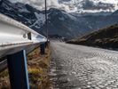 Aerial view of a mountain range in Austria, with the sun shining down on the landscape. The road curves through the mountains, offering a scenic drive. Clear sky and sunshine create a picturesque scene.