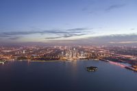 This is an aerial view of a modern cityscape in Jiangsu, China. The high-rise buildings reflect in the calm waters of the lake, creating a stunning reflection. The city is situated on an elevated area, providing an overlook of the horizon and the sea in the distance. The skyline showcases the metropolitan area's impressive modern architecture. This photo captures the essence of a dawn in Jiangsu, with the sky painted in hues of orange and blue. It offers an overview of the urban landscape and showcases the beauty of this Asian city.