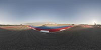 a view of an open race track from a fish eye lens in midair with a person riding a motorcycle