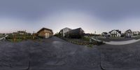 Aerial view of a residential area with old-style architecture. The town is surrounded by open spaces and nature, including trees, grass, and a lake. The buildings feature unique facades and windows. The overall landscape is a charming blend of urban and natural elements.