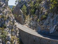 An aerial view of an elevated road in Mallorca, Spain. The road curves through a stunning canyon landscape with clear skies above. Experience the high nature of the Balearic Islands in Europe.