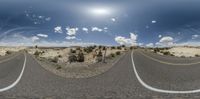 Aerial view of a straight road in rural Utah, surrounded by stunning landscapes. The road stretches towards the Head of the Rocks, with shadows creating a captivating contrast. A high position captures the beauty from top to bottom.