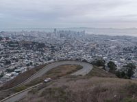 An aerial view of San Francisco cityscape at dawn, showcasing a winding road down a hillside surrounded by a suburban residential area. The road, made of asphalt, leads to a metropolitan area with lots of tall buildings and a captivating city skyline. The image also features an elevated highway with lanes and curves, along with an Armco barrier for safety. This urban landscape is seen from an overlook, providing an overview of the entire scene. The grey sky compliments the high-rise structures and infrastructure of the city.