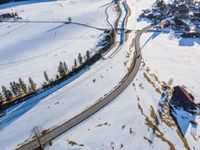 An elevated aerial view of a snowy countryside in Germany. The open space is covered in snow, with a clear sky in the background. The road winds through the landscape, offering a high position view of the mountains.