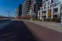 Aerial view of a straight road in the city of Toronto, Ontario. Buildings, houses, and condominiums line the road. Clear sky and hard shadows create a dramatic cityscape. Urban design with street lights and vegetation.