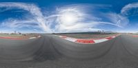 a 360 - angle view of a track with clouds over it and the camera panning it