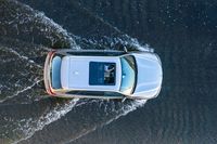an aerial view of a white vehicle driving through water in the middle of a body of water