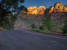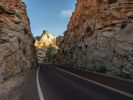 Aerial view of an asphalt road in Zion National Park, Utah. The road stretches straight and disappears into the mountainous landscape. Hard shadows from the sun visible as dawn breaks with clear skies.