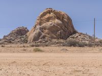 A solitary rock sitting on the endless desert landscape in South Africa. Clear sky and mountainous backdrop create a sense of isolation and tranquility. Off-road track winds through the sandy surface leading to the rock formation.