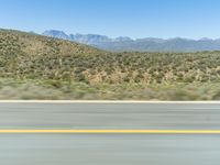 view of the mountains from a moving car window and a highway as it drives near the desert