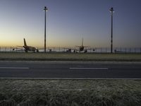 An airplane from an aerospace manufacturer is parked on an asphalt runway during dawn. The mode of transport vehicle, used for air travel and aviation, can be seen in the image.