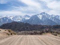 A dirt road winds through Alabama Hills, California. The landscape is marked by clear skies and distant mountains, typical of the desert scenery. Ideal for off-road adventures in the USA.