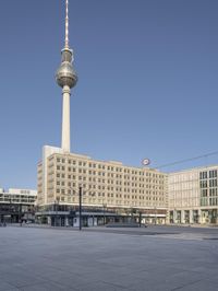 This stock photo features the iconic television tower towering over other buildings in the city square of Berlin, Germany. The modern architecture, high-rise buildings, and open space of Alexanderplatz create a vibrant cityscape. The clear sky complements the urban design and showcases the bustling city life. Alexanderplatz is a popular tourist attraction and a hub for public spaces and town squares. Get a packshot of the city's facade, line, and street lights against the backdrop of the skyscrapers. Explore the beauty of Berlin and experience the vibrant city atmosphere in Europe.